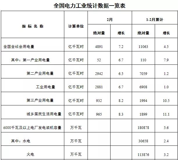3月20日,国家能源局发布1-2月份全国电力工业统计数据。1-2月,全社会用电量累计11063亿千瓦时,同比增长4.5%;全国售电量9557亿千瓦时,同比增长6.1%