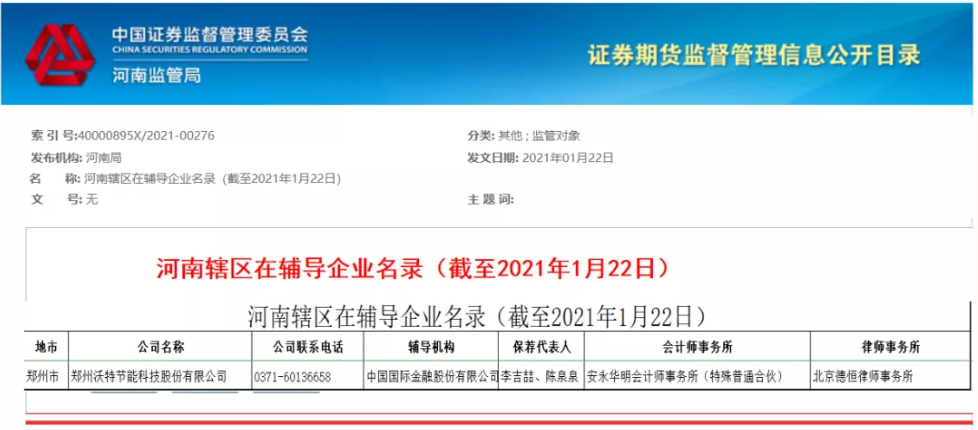 河南省证监局2021年1月22日发布公示,郑州3044永利集团科技股份有限公司拟在A股市场首次公开发行股票并上市,正在接受中国国际金融股份有限公司对其进行辅导,并已于1月22日在河南证监局进行辅导备案。